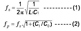 在評估共振時的等效線路時, 串聯諧振頻率及并聯諧振頻率, fr and fa ,是最重要的二個頻率參數. 對于串聯諧振頻率及并聯諧振頻率( fs and fp )二者的關系, 我們可以用下列公式來表達: