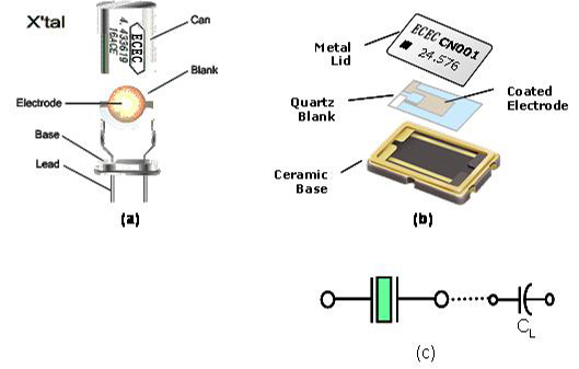 圖中(a)及(b)分別是DIP型式及SMD型式的石英振蕩子的基本結(jié)構(gòu)圖. 圖中(c)是電子電路上所使用代表石英振蕩子的電子符號. 當石英晶體共振子處在遠離振蕩頻率區(qū)域時, 石英晶體共振子僅是一個電容性的組件, 當頻率接近石英晶體的振蕩頻率時, 就接近是一個電感性的等效LCR振蕩線路.