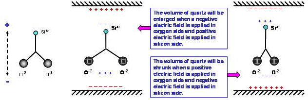 氧原子的水平位置變化時, 鄰近的另一個氧原子會相對的產(chǎn)生排斥或吸引的力量, 迫使氧原子回到原來的空間位置. 因此, 電場的力量與原子之間的力量會相互牽動, 電場的改變與水平方向的形變是形成交互作用狀態(tài). 這個交互作用會形成一個在石英材料耗能最小的振動狀態(tài), 祇要由電場持續(xù)給與能量, 石英材料"9HT11-32.768KAZF-T"就會與電場之間維持一個共振的頻率. 這個壓電效應(yīng)下氧原子的振幅與電場強(qiáng)度及電場對二氧化硅的向量角度有相對應(yīng)的關(guān)系.在實(shí)際的應(yīng)用上, 電場是由鍍在石英芯片上的金屬電極產(chǎn)生, 電場與二氧化硅的向量角度則是由石英晶棒的切割角度來決定.