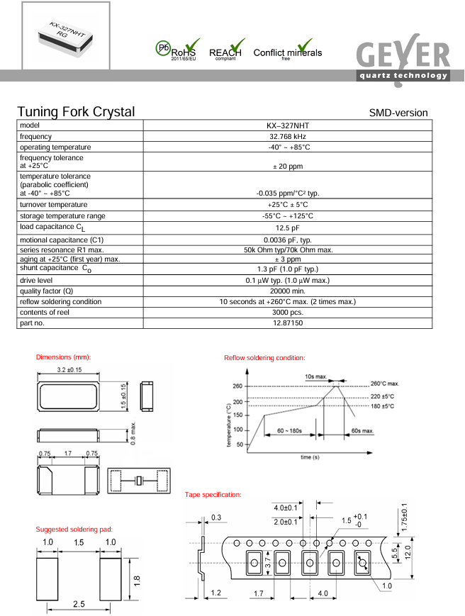 12.87156 | GEYER | CRYSTAL 32.768KHz 12.5pF SMD | KX-327NHT | ±20ppm | -40°C ~ 85°C | 2 | 3215 | Geyer |