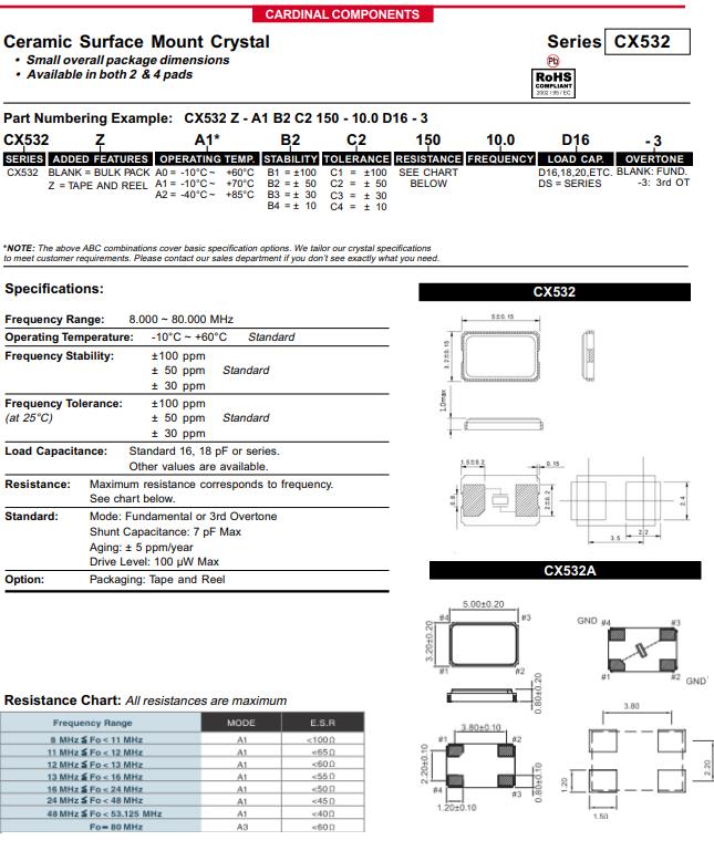 CX532Z-A2B3C5-70-8.0D18 | Cardinal晶振 | CRYSTAL 8.0000MHZ 18PF SMD | CX532 | MHz Crystal | 8MHz | ±30ppm |