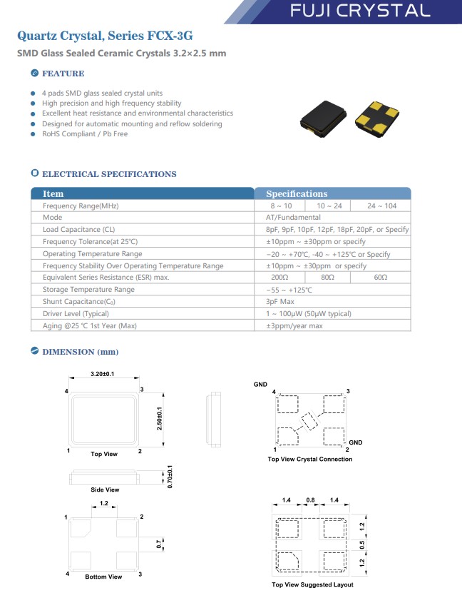 更多>>陶瓷車規溫度富士晶振FCX-3G 3225 8MHZ 8PF -40+125汽車控制模塊