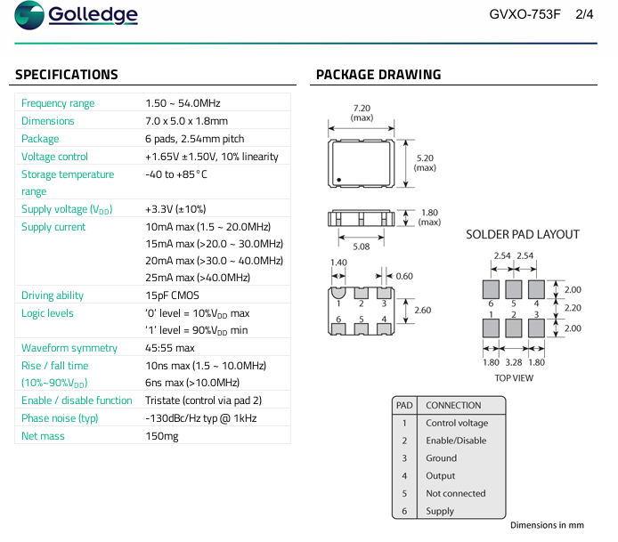 更多>>GVXO-753F/VC 27.0MHZ 7050 6P VCXO壓控晶振Golledge