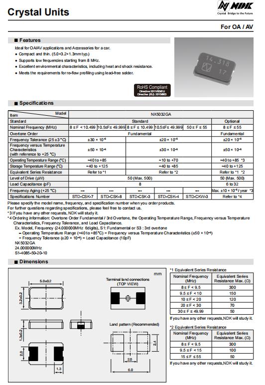 更多>>NDK緊湊型無源晶體NX5032GA-16.000M-STD-CSK-4專享于理想OA和汽車應用