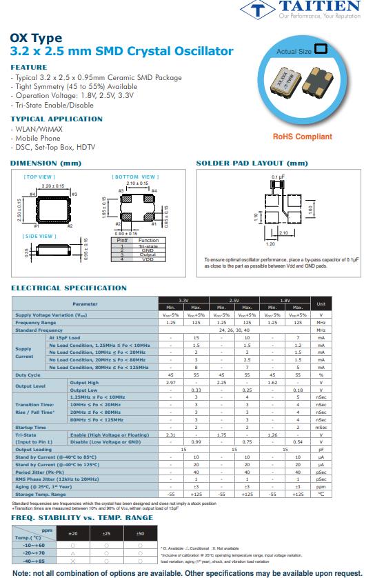 OXETDLJANF-25.000625 | Taitien | OX | XO (Standard) | 25.000625MHz | 3.3V |
