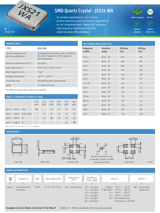 Q 16.0-JXS21-9-10/15-T1-WA-LF | Jauch Quartz | JXS21-WA | 16MHz | ±10ppm | 9pF | -40°C ~ 85°C | 4 | (2.00mm x 1.60mm) |
