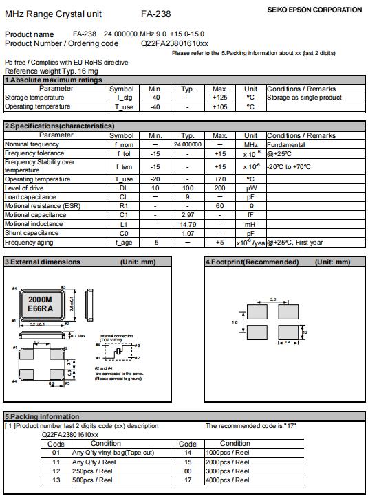Q22FA2380157016 | 3.2 x 2.5 x 0.7mm | FA-238晶振 | 24.000000 MHz | 15 pF | +/-50 ppm | +/-30 ppm | -20 to +70 °C | ≤ 60 Ω |