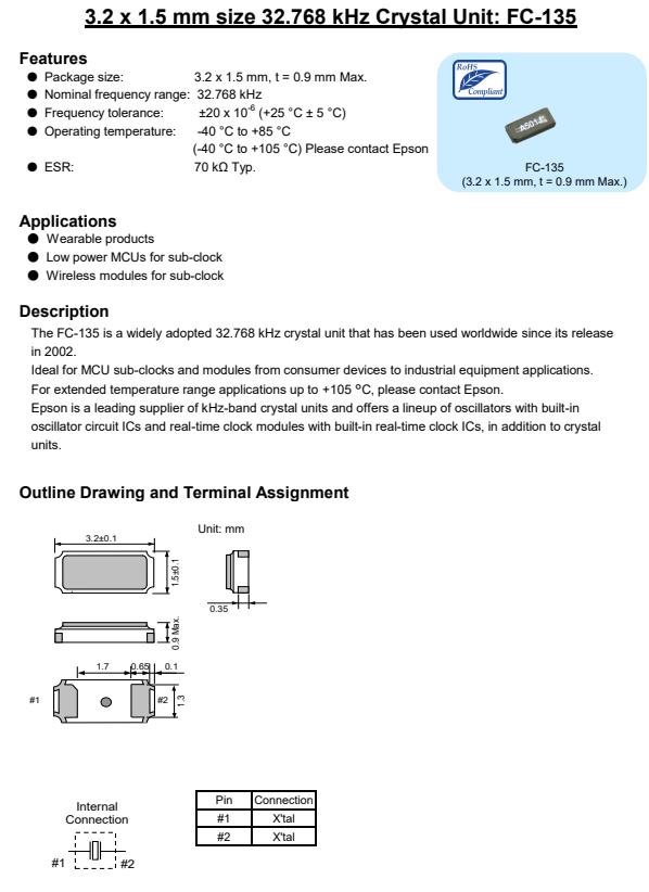 X1A0001410001 | 3.2 x 1.5 x 0.9 mm | FC-135R | 32.768kHz | 7 pF | +/-20.0 ppm | -40 to +85 °C |