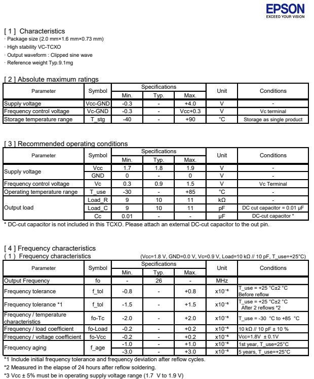 X1G004131003416 | TG-5006CJ | 26.000000 MHz | 2.00 x 1.60 x 0.73 mm | 1.700 to 1.900 V | +/-1.5 ppm | -30 to +85 °C | +/-2.00 ppm |
