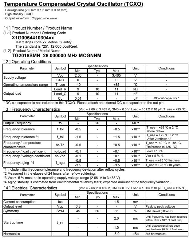 X1G005441030425 | TG2016SMN | 26.000000 MHz | 2.00 x 1.60 x 0.73 mm | 2.660 to 3.465 V | +/-1.5 ppm | -40 to +85 °C | +/-0.50 ppm |