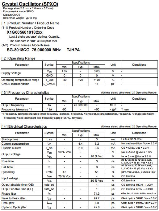X1G005601018200 | SG-8018CG | 75.000000 MHz | 2.50 x 2.00 x 0.80 mm | CMOS | 1.620 to 3.630 V | -40 to 105 °C | +/-50 ppm |