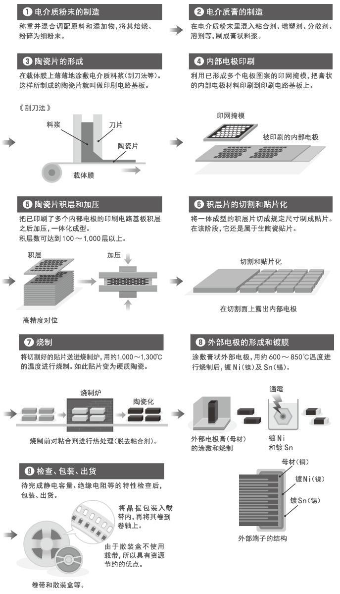 Ti02(氧化鈦)等 | 雖然無法實現大容量,但因為由溫度所引發的容量變化小,所以除用于溫度補償外,也可用于高頻電路等. |